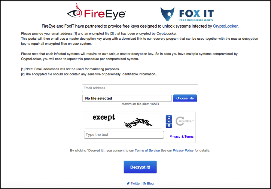 To help solve the problem of victims’ files still being encrypted, we leveraged our close partnership with Fox-IT. We developed a decryption assistance website and corresponding tool designed to help those afflicted with the original CryptoLocker malware. Through various partnerships and reverse engineering engagements, Fox-IT and FireEye have ascertained many of the private keys associated with CryptoLocker. Having these private keys allows for decryption of files that are encrypted by CryptoLocker.