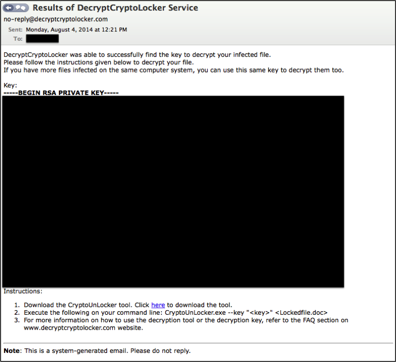 After receiving the email (Figure 4), you will then select the key and utilize it in conjunction with Decryptolocker.exe.