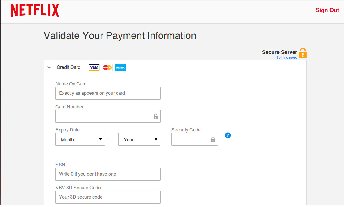 Figure 3: Netflix phishing webpage used to steal credit card information