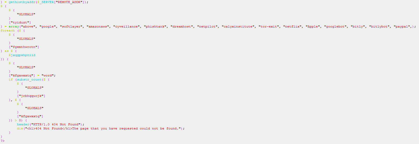 Another technique is the host-based evasion, as seen in Figure 7. The host name of organizations such as ‘phishtank’ and ‘google’ are blacklisted. The host name of the client is compared against a list of blacklisted host names. If there is a match against the blacklist, a “404 Not Found” error page is presented.